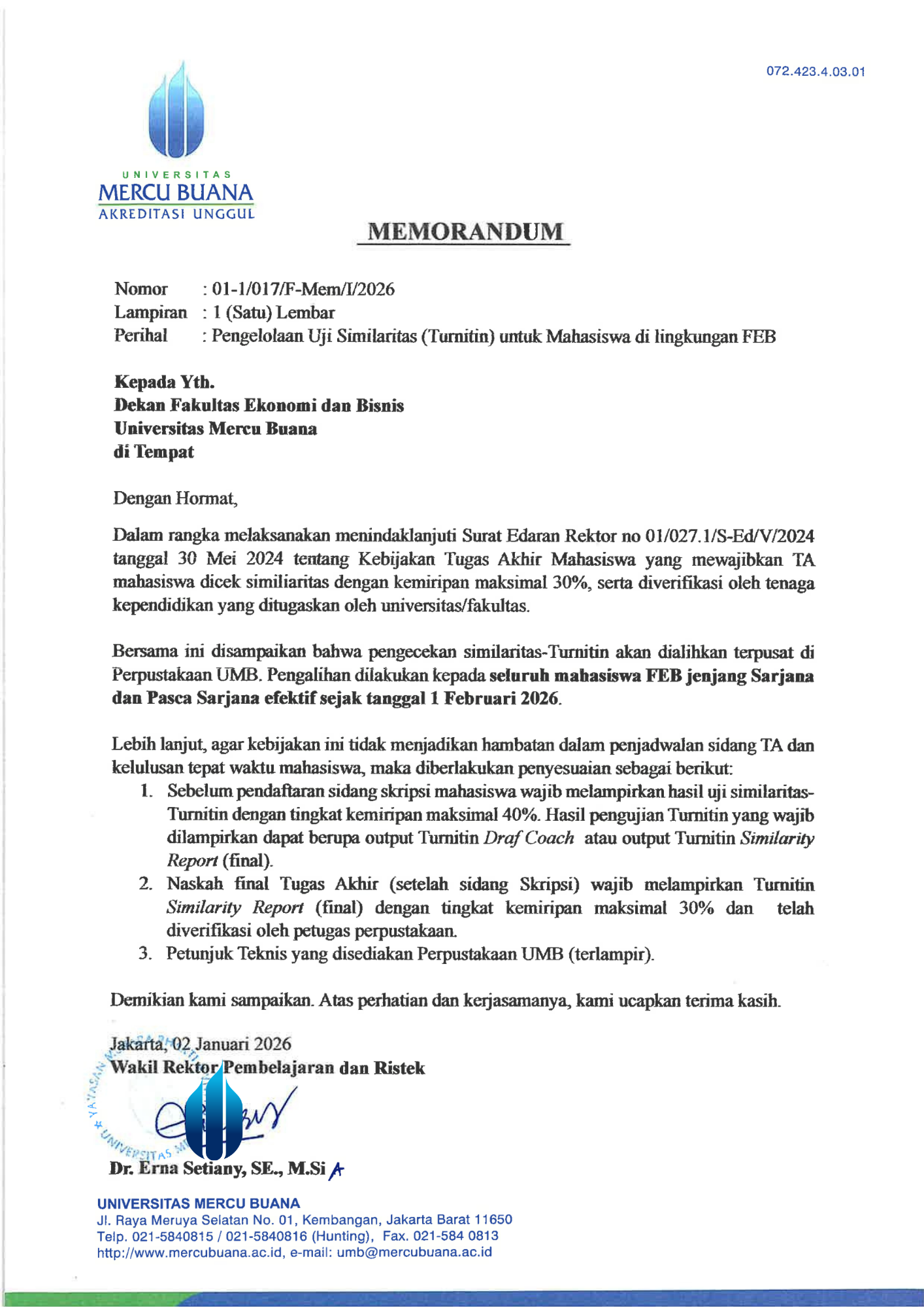 MEMORANDUM PENGELOLAAN UJI SIMILIARITAS (TURNITIN) UNTUK MAHASISWA DI LINGKUNGAN FEB.pdf.pdf