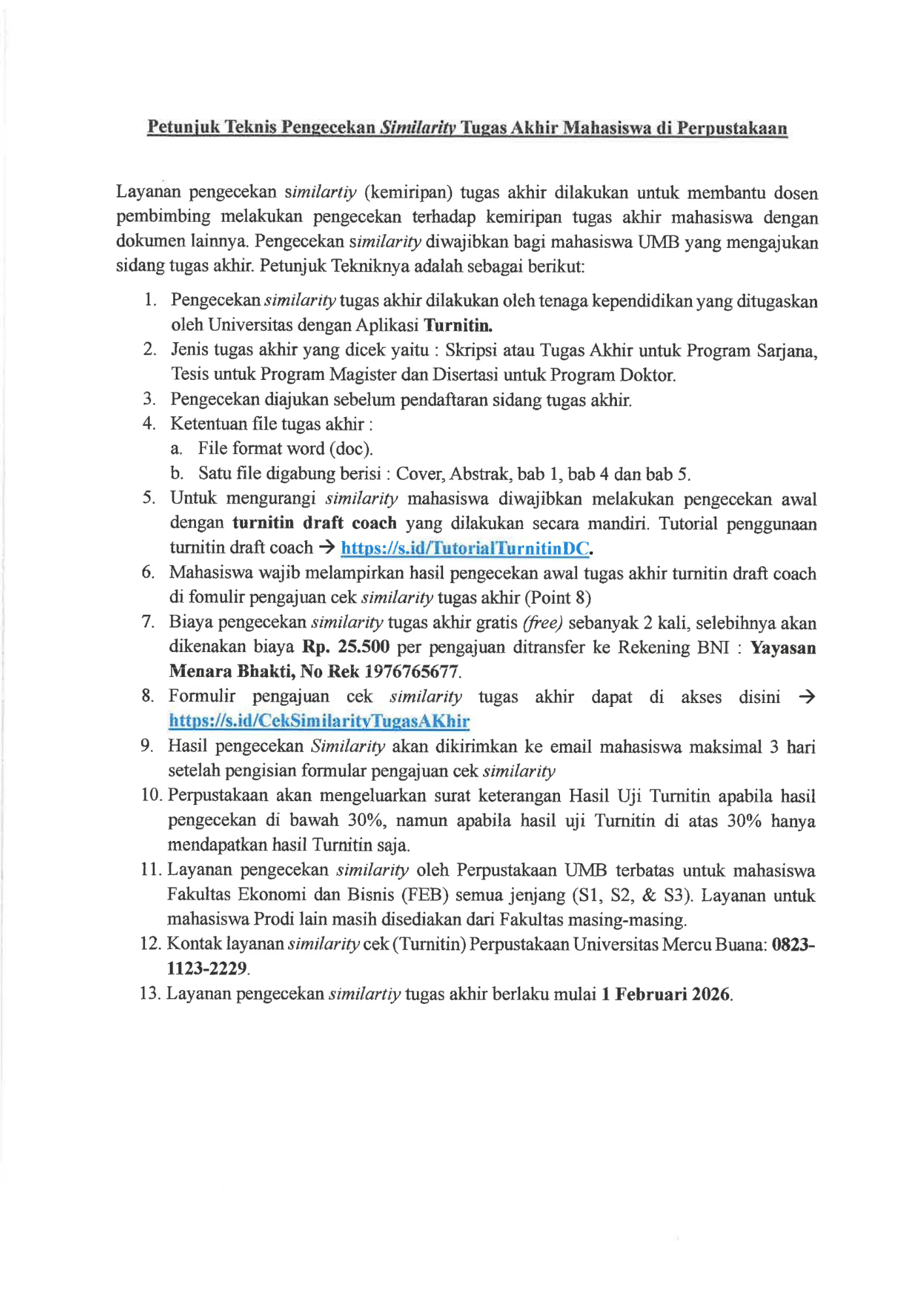 Terhitung mulai 1 Februari 2026 Perpustakaan membuka layanan pengecekan turnitin tugas akhir (skripsi) secara terbatas khusus untuk mahasiswa S1, S2 dan S3 di lingkungan FEB.