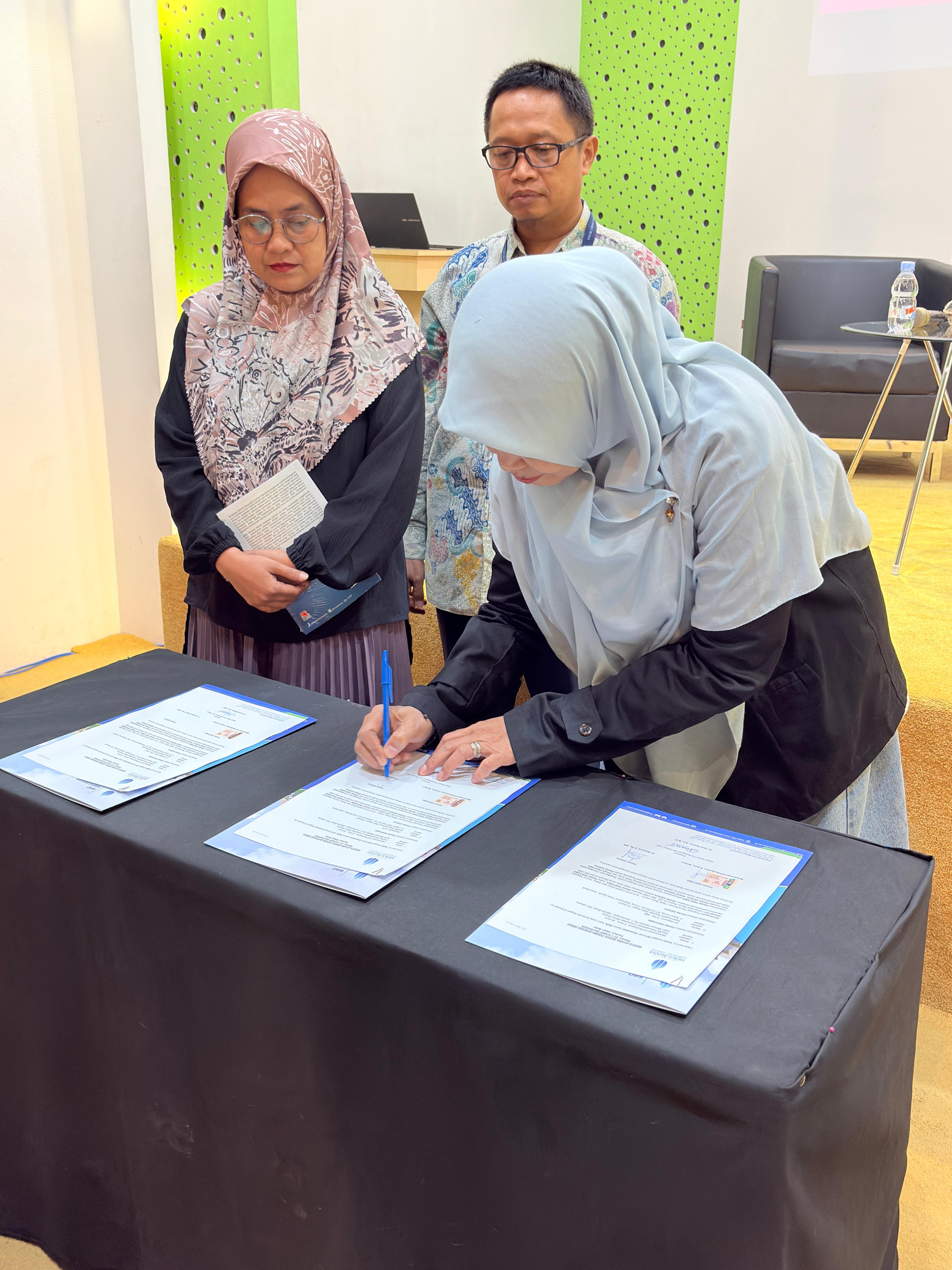 Dalam kegiatan penyerahan hibah buku ini ditandai dengan penandatanganan berita acara hibah buku oleh kedua pihak yaitu dari Pihak Perpustakaan UMB di wakili oleh Kepala Biro Perpustakaan, Muhammad Arif Budiyanto, S.Kom., M.Hum., dan perwakilan dari masing-masing Pihak Sekolah yang menerima Hibah Buku, yaitu: Pihak SMAN 7 Bekasi di wakili oleh Kepala Perpustakaan SMA Negeri 7 Bekasi, Dwipawati, S.Pd., dari SMAN 10 Depok di wakili oleh Wakil Kepala Sekolah SMA Negeri 10 Depok, Sri Wahyuni, S.Pd., MM., dan dari SMK An Nurmaniyah Tangerang di wakili oleh Kepala Sekolah SMK An Nurmaniyah, H. Achmad Hilal, S.Pd., M.M. Ucapan Terimakasih disampakan oleh Perwakilan Sekolah atas hibah buku yang akan diterima. Dilanjutkan penyerahan berita acara oleh Pihak Perpustakaan UMB ke perwakilan masing-masing sekolah.