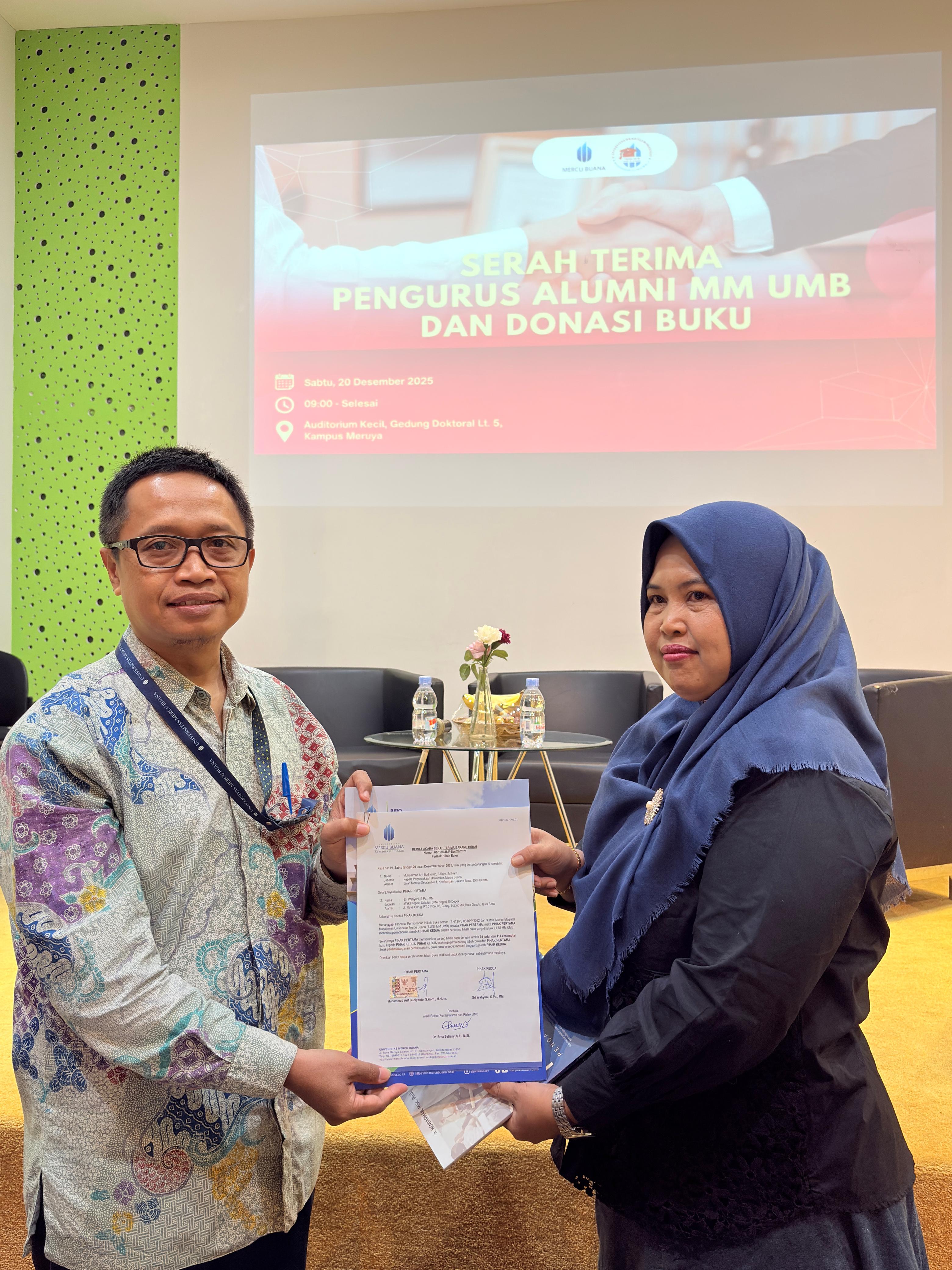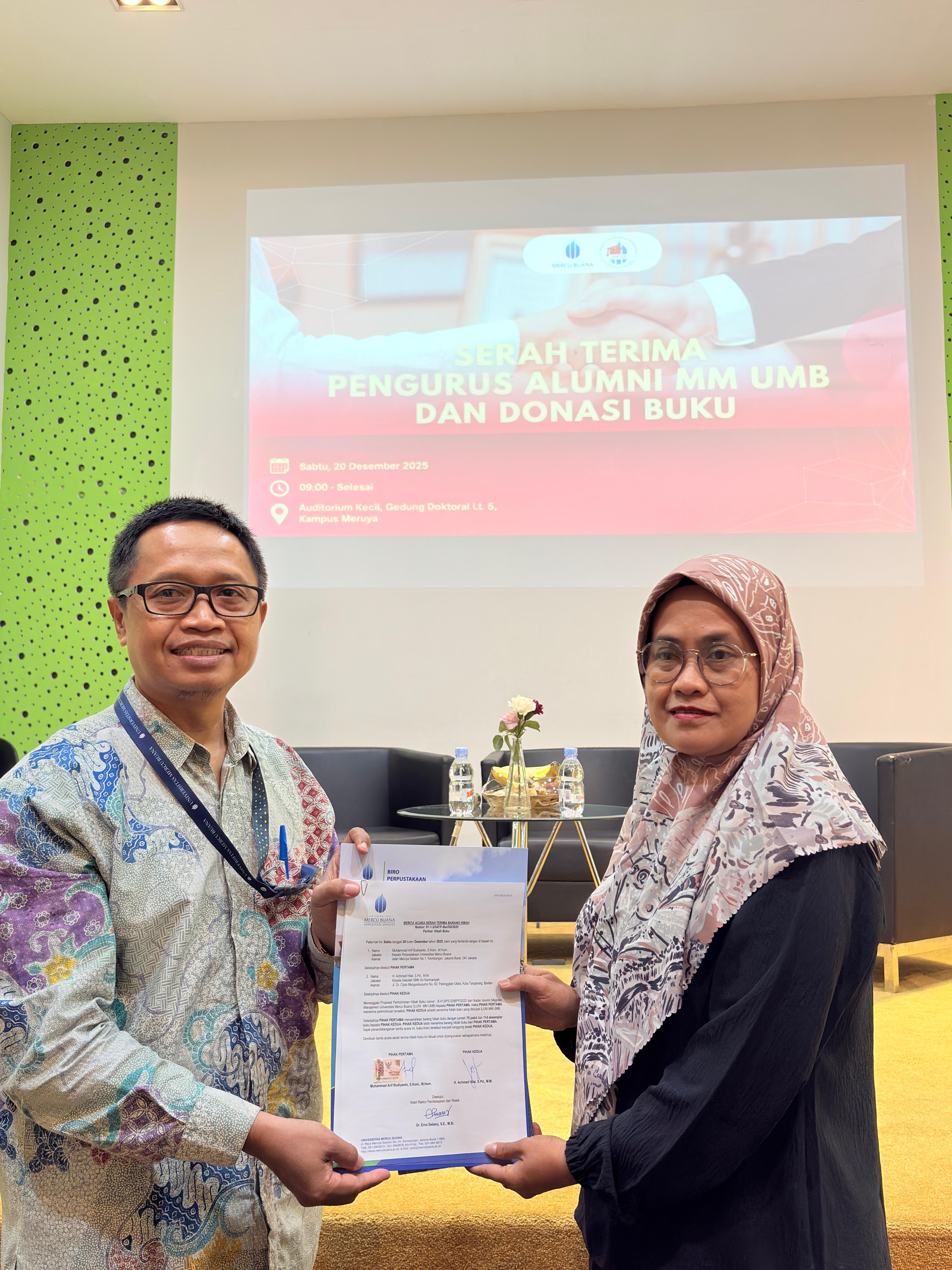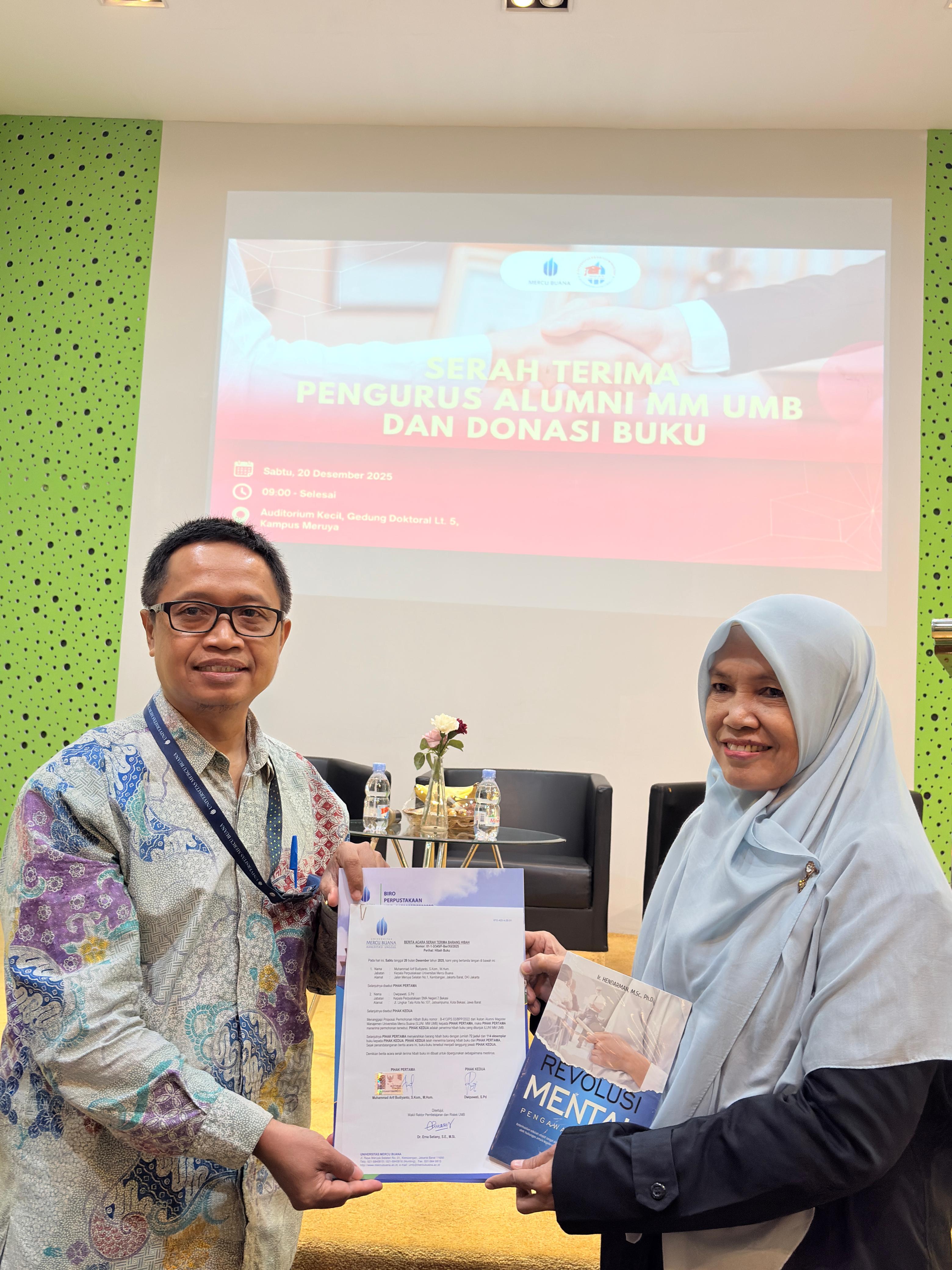 Pada hari Sabtu, 20 Desember 2025 lalu, Perpustakaan Universitas Mercu Buana (UMB) besama Ikatan Alumni Magister Manajemen mengadakan acara Hibah Buku ke beberapa Sekolah Menengah Atas yang ada di Jabodetabek, yaitu SMAN 7 Bekasi, SMAN 10 Depok, dan SMK An Nurmaniyah Tangerang yang dilaksanakan di Auditorium Gedung Doktoral. Acara tersebut dihadiri oleh perwakilan Biro Perpustakaan UMB, Kaprodi Magister Manajemen, Pengurus Ikatan Alumni Magister Manajemen dan perwakilan dari ketiga sekolah.